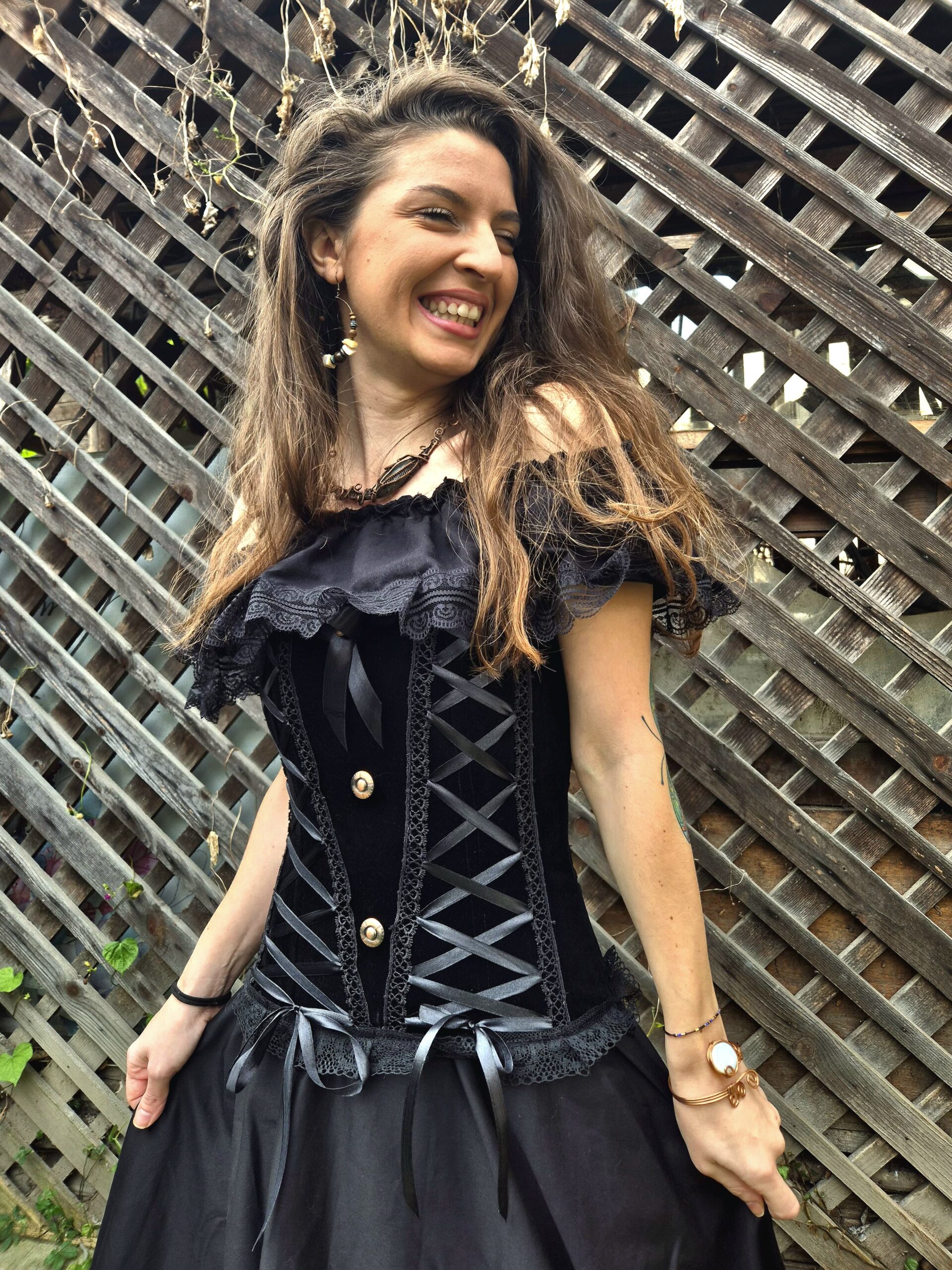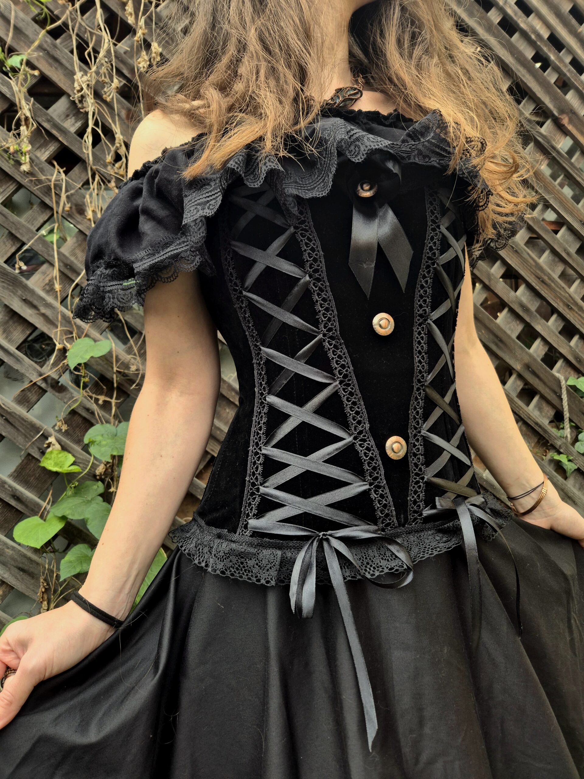 The Velvet Regalia: A luxurious velvet corset enriched with satin details and ornate metallic buttons. The adjustable back lacing ensures a silhouette sculpted to perfection.