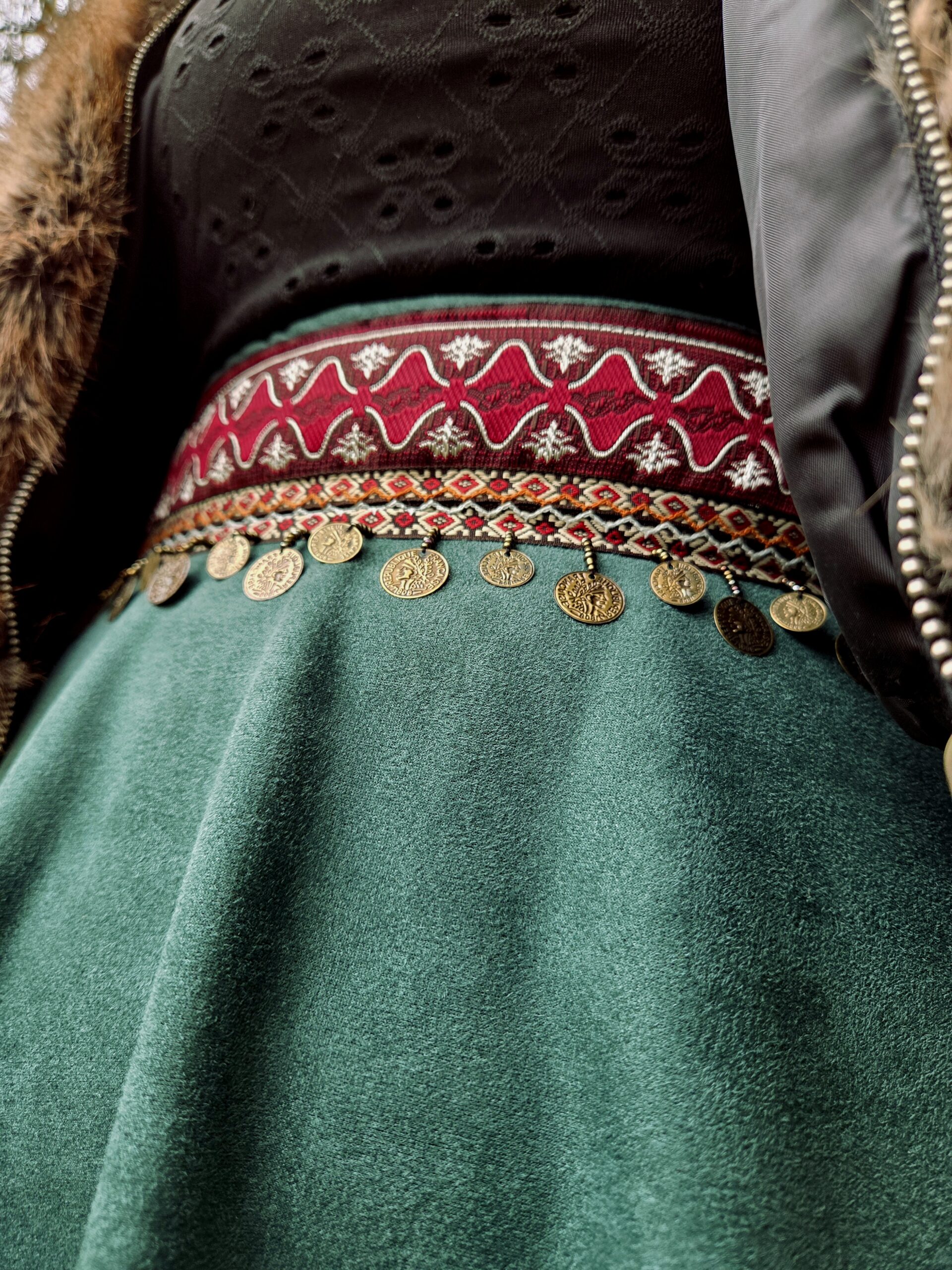 Embrace your inner free spirit with this stunning forest green suede maxi skirt. Designed for the modern nomad, this piece features a captivating ethnic trim adorned with oriental-style coins that dance with every step you take.